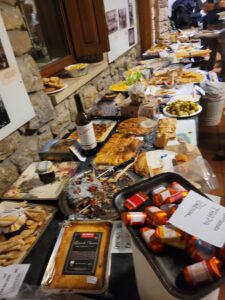El local de la Junta Vecinal de San Vicente del Monte, con advertencia de que la rampa de entrada estaba resbaladiza por la humedad del ambiente, acogió la llegada de los primeros entecianos a partir de las 18:00, ávidos de abrazos y dispuestos a liberar sus manos del contenido de bolsas llenas de viandas de todas partes de España: empanadas variadas (un clásico de estos encuentros); quesos de Asturias, de Arzúa, de Palencia y manchegos; tortilla de pimientos, tortillas con cebolla y sin ella, con mención especial a las de la vecina Edel, ganadora del premio a la mejor tortilla de las fiestas del pueblo; embutidos de toda clase y condición, desde chorizo y salchichón de ciervo, a una cecina insuperable, morcilla clásica, patatera y calabacera. Todo regado con vino blanco, tinto o dulce, cerveza con alcohol y sin él, sidra y refrescos.
