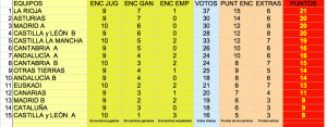 La Rioja sigue el primero … pero ya advertíamos que Asturias y Castilla y León B, sin hacer mucho ruido, estaban acechando, y ya estáaaa liada: 5 equipos en una distancia de 2 puntos en lo más alto. Y tres más con opciones a podium como mínimo!!! Y en la parte de abajo muuucho movimiento… que nadie se quiere quedar atrás.